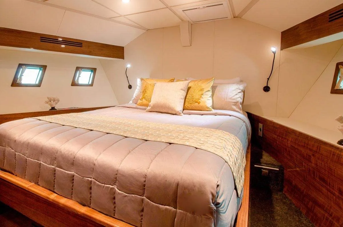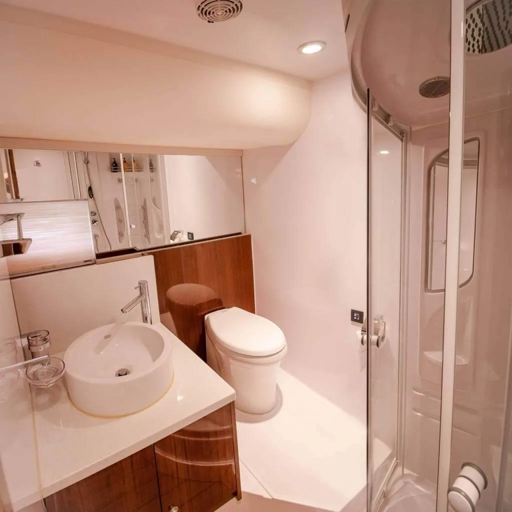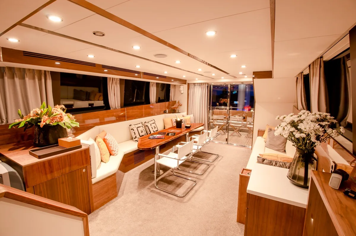 Her lush interiors spell out comfort and luxury, just like the spacious deck and the fly-bridge: Everything well equipped with all modern technology including karaoke and air-conditioning throughout.