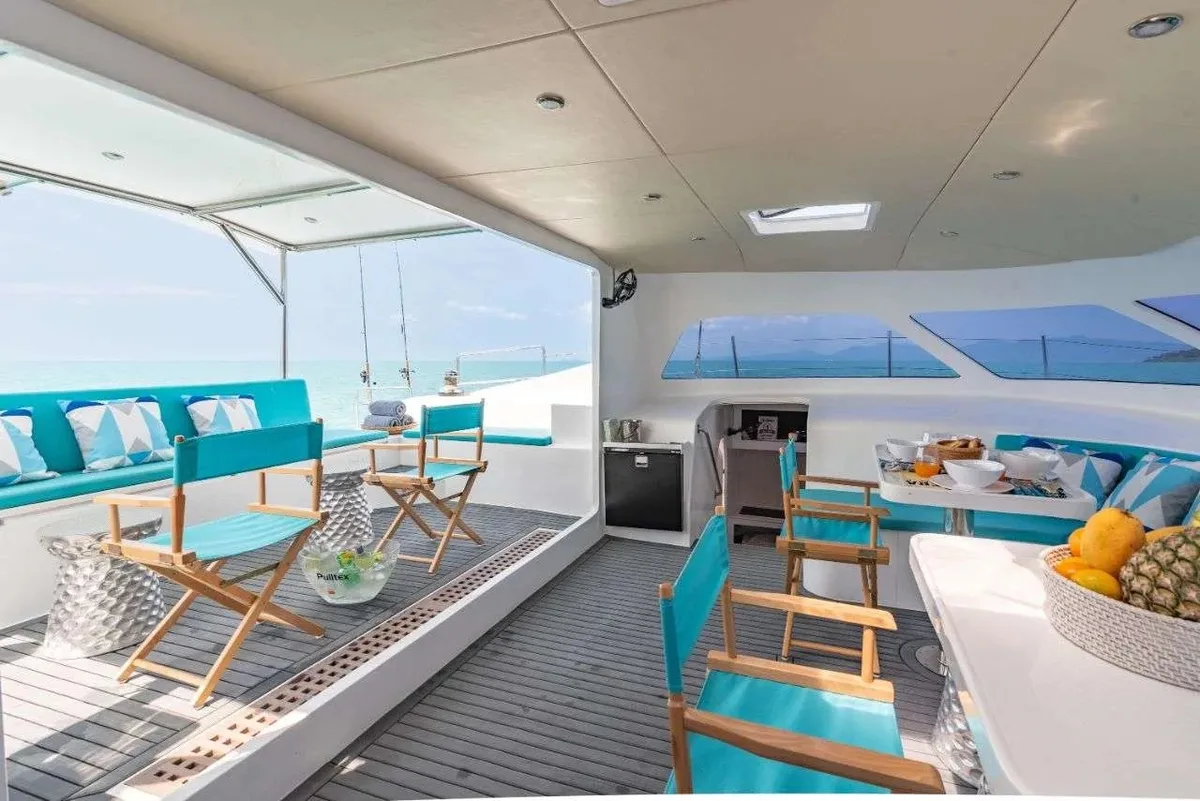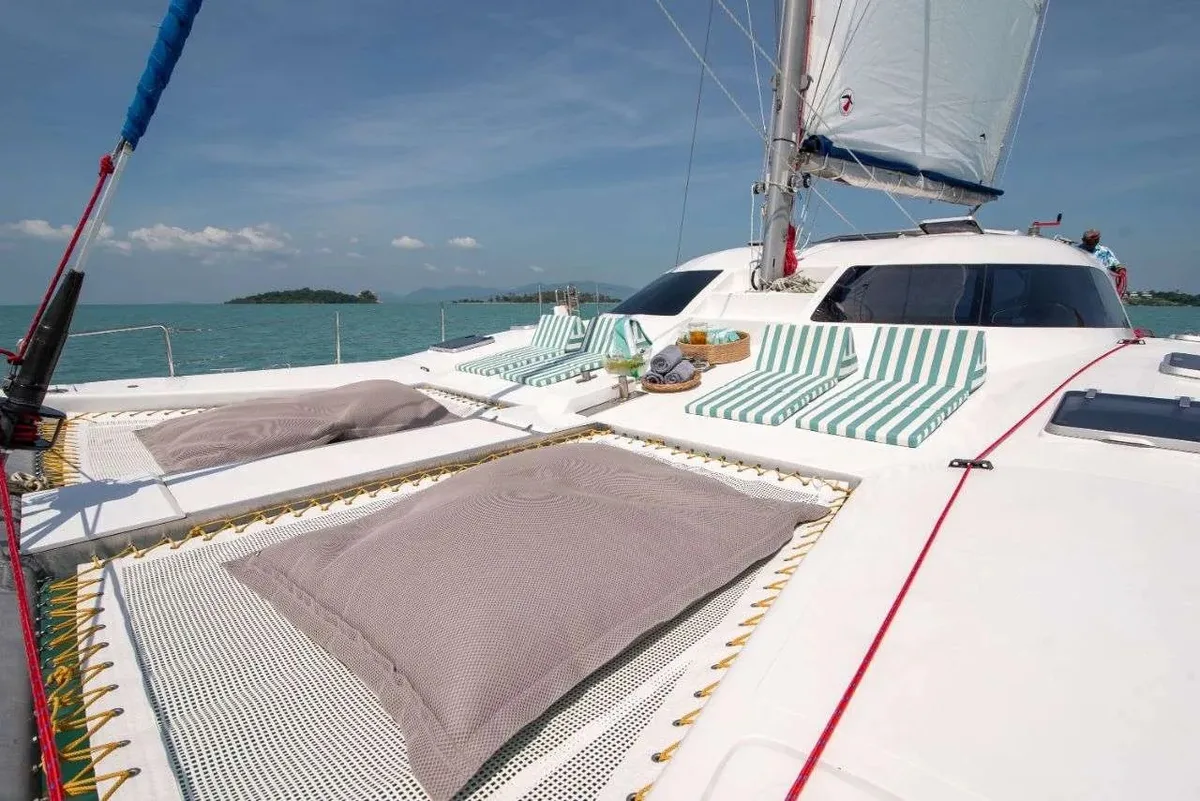 This luxury sailing Catamaran for Charter in Samui designed by the well-known UK-based boat designer and build in Thailand for tropical waters. With its spacious deck and salon, as well as a wide-decked platform at the stern its perfect for groups up to 18.
