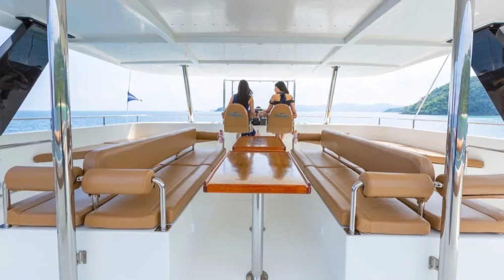 This is the right charter yacht for groups who like to sail with fun and plenty of space. Perfect power catamaran in Phuket for parties with family or friends. Water slider and inflatable pool included (on full-day tours).