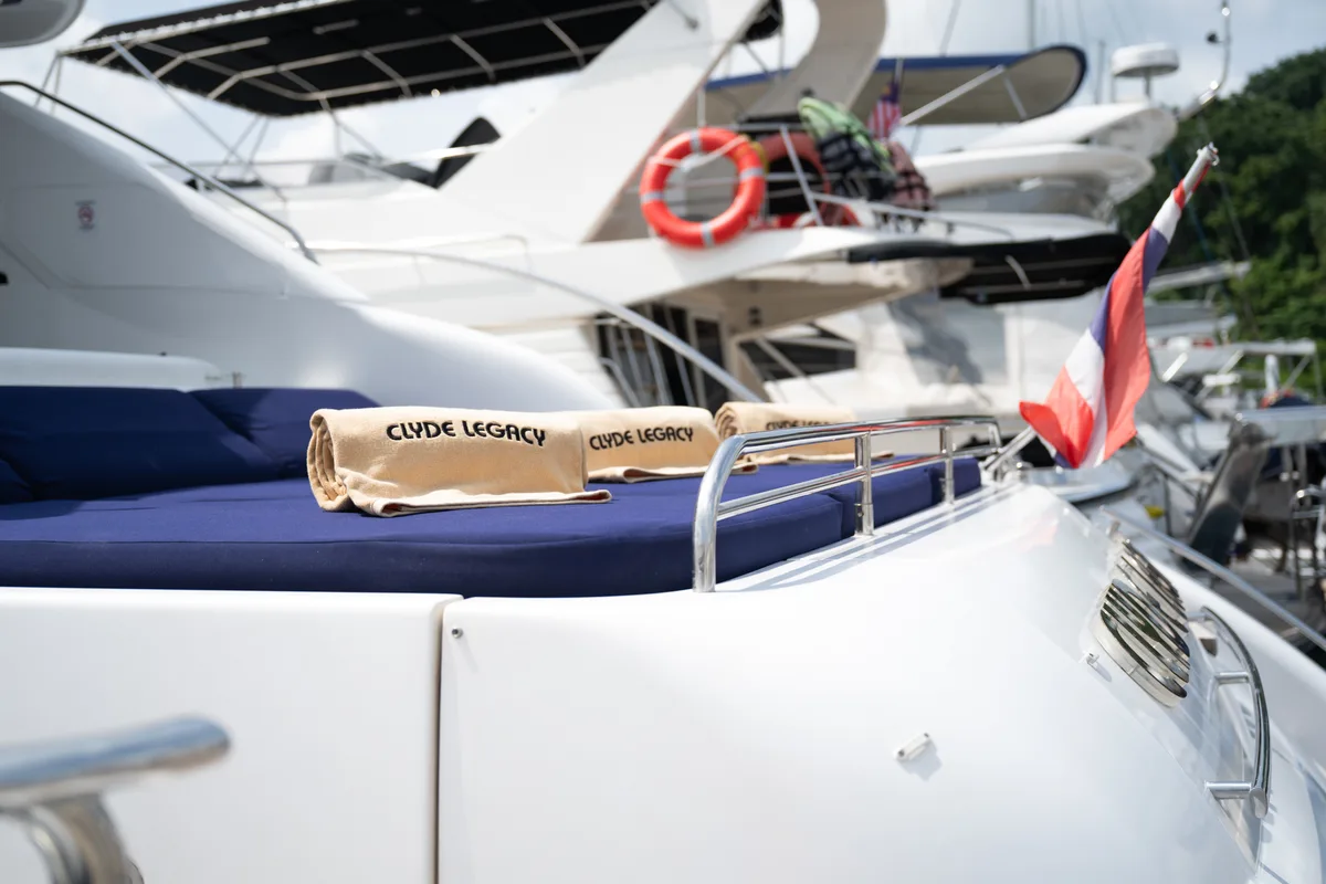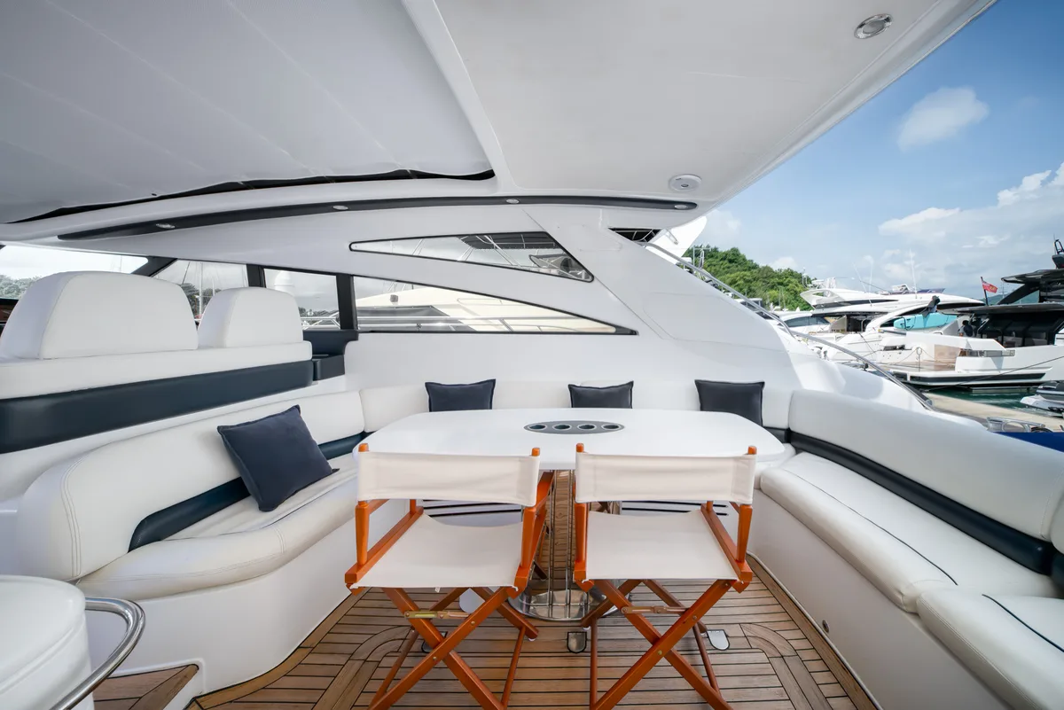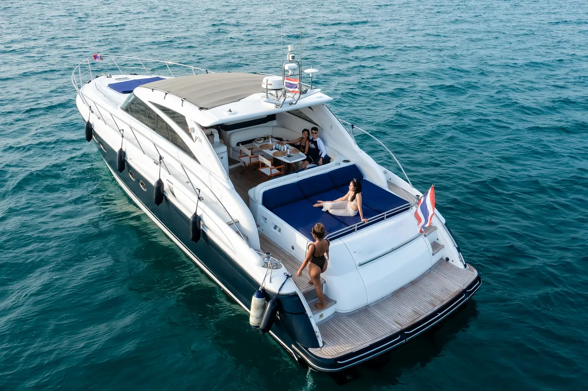 Experience luxury aboard Bonnie, our renowned 2018 Princess V58 for charter in Phuket. Accommodating up to 17 guests, this sleek and sportive yacht cruises at a swift 17 knots, perfect for island hopping adventures in Phuket's stunning waters!